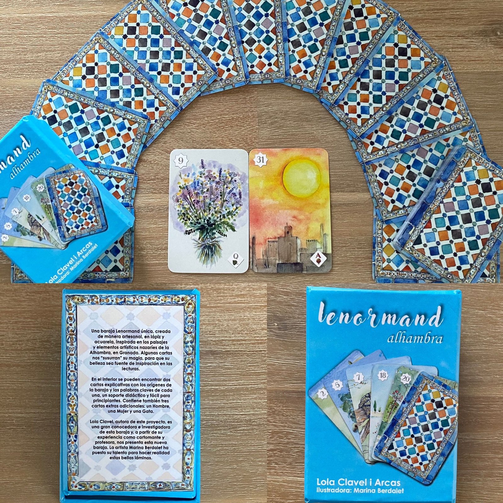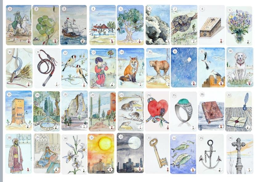 Esta baraja contiene 39 cartas. Las 36 cartas del oráculo tradicional, más 3 cartas extras añadidas: un Hombre, una Mujer y un Gato. Incluye además tres tarjetas explicativas: el orígen de este oráculo, las biografías de la autora e ilustradora y una tarjeta con las palabras claves de cada carta.